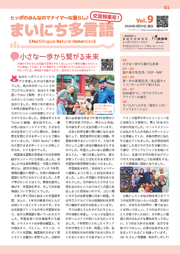 会報誌「まいにち多言語」はヒッポファミリークラブ会員向けに編集・発行しています。活動やイベントについてのお問い合わせは一般財団法人 言語交流研究所・ヒッポファミリークラブへお願いいたします。