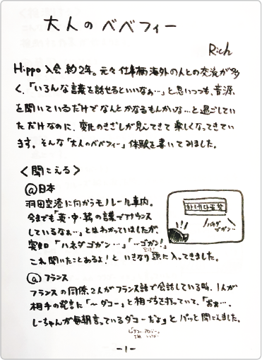 生後6ヶ月から両親と一緒に始めたヒッポ。社会人になりヒッポから離れていた時期もありましたが、結婚して長男を出産した2か月後に、茨城での講座に母に誘われたのが、ヒッポ生活再始動のきっかけでした。子どもの時から何も変わらないファミリーでのSADA、メタ活*、交流。でも明らかに違った環境が一つありました。ヒッポの多言語の音源の聞き方『S多重P』です。せいぜい各部屋に1台だった音源が、リビングだけで15台?なぜ?というのが最初の感想でしたが、22台置いてみて実験だー!でもS多重Pによる体感はほぼなし。それよりファミリーに出るたび、自分の口から出ることばの多さにびっくり。子どもの時メタ活の時間は参加せず、ピアノの裏に隠れていた私。なのにその頃大人たちが歌っていた場面が今、私の口からスラスラ出てくる。