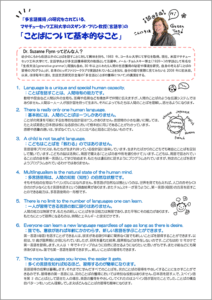 当日、スザンヌさんが講演会・ワークショップで話してくださった内容の要約を一部抜粋して紹介します。(文責:まいにち多言語編集チーム)