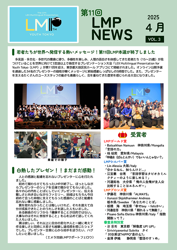 第11回LMP (LEX Multilingual Presentation) Youth Tokyo本選が3月20日(木・祝)に大田区民ホール・アプリコにて開催されました。87名がチャレンジしたオンライン予選を勝ち抜いた、15か国34名の若者たち(高校1年生~25歳)が、多言語(3言語以上)で、自らの多言語体験に基づいたメッセージを、世界・社会に向けて発信しました。当日会場を運営しているのもプレゼンターと同世代のYouthスタッフの若者たち約150名。舞台袖では、司会、PC操作、プレゼンター誘導など、会場周りでは、来場者誘導、映像・撮影など、表からも裏からも彼らの力で会を支えています。